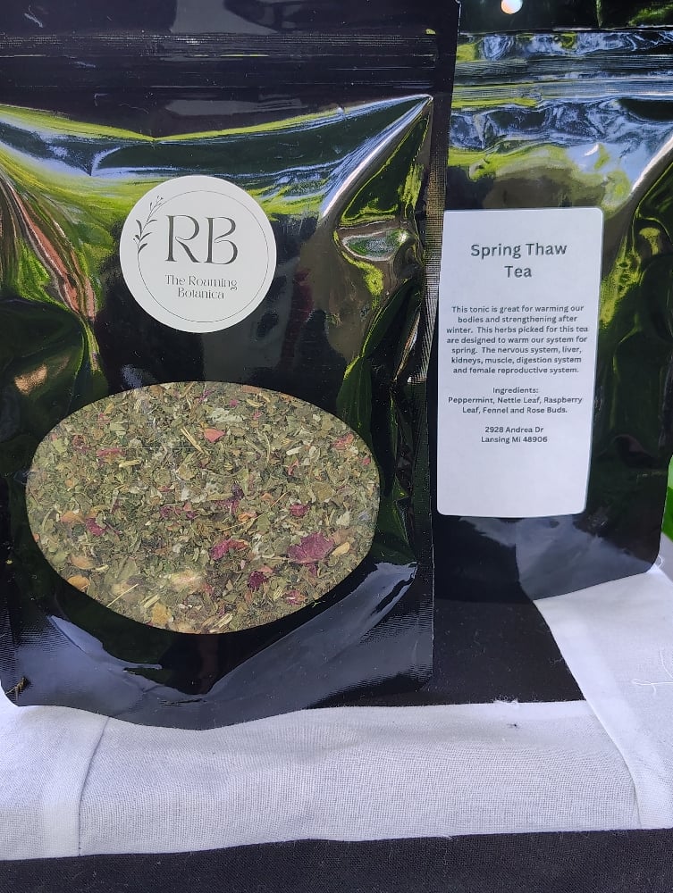 This tonic is great for warming our bodies and strengthening our bodies after a long winter. The herbs picked for this tea are designed to warm our system for spring. The nervous system, liver, kidneys, muscle, digestion system and female reproductive system. Ingredients include: Peppermint, Nettle Leaf, Raspberry Leaf, Fennel and Rose Buds. About 25 servings per bag.